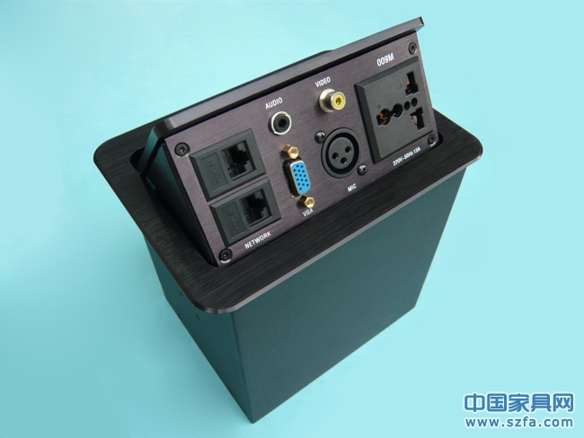 桌面隐藏式插座系列为用户提供了一个时尚、美观的桌面信号连接解决方案;它采用简单易用的接入方式,我们在连接视频、音频、计算机视频、网络、电话、电源等接口时,轻按连接盒的顶部,连接盒即时释放机械锁定器,接口盒面被气撑式结构平滑打开,完全展现出连接接口面,使用完毕后,只需轻轻按下接口盒盖,机械锁定器立即锁定连接盒;锁定后的连接盒与桌面保持齐平,所有接口被巧妙地隐藏起来,盒面美观整洁并与桌面浑然一体,该产品柔和开启,安全、方便插拔接口、开启容易、静音,可以在-10℃以上正常工作主要用于会议、酒店办公家具桌上,安装方便灵活,可以选择多个并排安装,目前是同类产品较高档的,最美观的一款多功能组合插座装置。