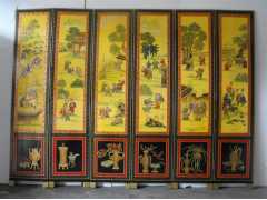 【产品工艺】纯手绘漆画屏风,堆金手法,画面凸出有浮雕效果,贴金、银箔工艺