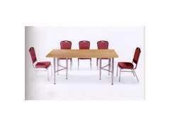 此套家具桌面采用松木皮饰面,底架采用电镀不锈钢。椅架采用电镀不锈钢,椅面及背采用高回弹海绵。