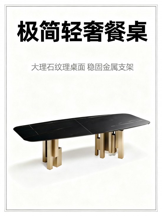 2. 模块化几何金属桌架,冷色调金属光泽与岩板形成视觉碰撞,兼具稳固性与艺术美学。