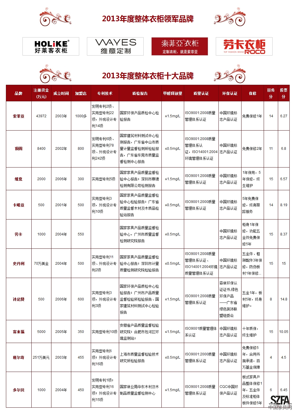 由中国名企排行网主办的2013(第六届)中国整体衣柜品牌评价活动伴随着衣柜行业的发展,在广大衣柜企业的支持下自2008年起,每年进行一次行业盘点,活动秉承客观、公正的原则,从企业的注册资金、从业年限、专利技术、质量认证、环保认证、专卖店数量、营销状况、公司荣誉、售后服务等十多项指标进行综合评价,每年榜单的公布都成为业内关注的焦点,今年的上榜的十大品牌:索菲亚、顶固、维意、卡喏亚、劳卡、史丹利、诗尼曼、客来福、班尔奇、多尔贝。主办方希望各上榜企业重视自身品牌建设的同时能够不断提高产品质量和服务,以维护自身品牌形象。