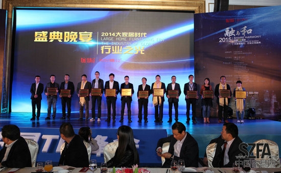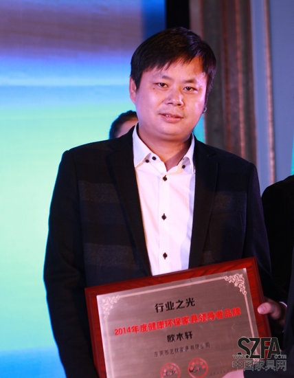 在随后的大家居时代行业之光盛典的颁奖环节上,欧木轩家具营销总监杨军上台领取了“2014年度健康环保家具领导者品牌”奖牌。