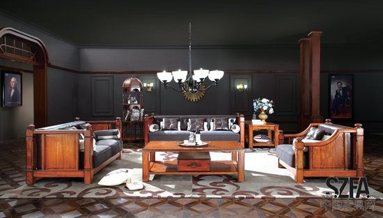 该款沙发是上套沙发的休闲版。沙发采用了围合式设计,但3个位置采用的都是弧形的低扶手,可容易的将手搭上去,握住底端的总统印章盖,有如手握大权、君临天下之感。略微做旧的工艺,凹槽方柱的设计,显得经典、复古,让这套沙发更具有历史的沧桑感。