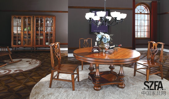 圆圆的女王餐台厚重大气,用料很足,可供6-8人用餐。餐台底部为4个花瓶柱。形如花瓶的支撑柱,设计灵感源于欧洲古代宫廷摆放的装饰花瓶,是美式或欧式家具中常用的装饰元素,富贵典雅,极具艺术美感。其制作工艺难度极大、损耗也大:先由机器雕刻,再由乐雅轩10年以上工龄的高级技师手工打磨、精雕、擦色等10余道工序才能完成,并且整块木料有一半多被去除、切挖,木料损耗极大。