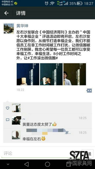 左右沙发倡导“早下班一小时”公益行动,那可不是口头说说。3月10日,左右董事长黄华坤“工作滚出朋友圈”的公司内部邮件爆出,并发通告3.20国际幸福日那天全体公司早下班一小时,网友们惊呼“求招人”;而此后在朋友圈不断呼吁,更是引发集体点赞。