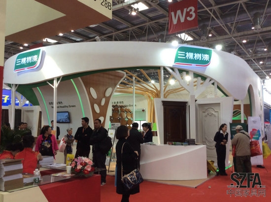 在鳞次栉比之间,一座造型新颖、清新靓丽的展台被观众所包围,自然、健康、绿色的环境表达,专业、清新、适意的格致服务,给观众以“春天来了”的感觉,这就是秉持“道法自然”的三棵树漆。