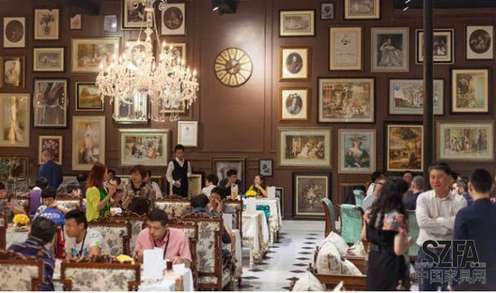 国王会所分为入口区、备餐区、用餐区、红酒柜和油画墙几大部分。其中由仁豪出品的58张软包靠背椅,为每一位观展者提供了舒适的座位。并特设单人位、双人位、4人位和8人位以适应不同团体组合。