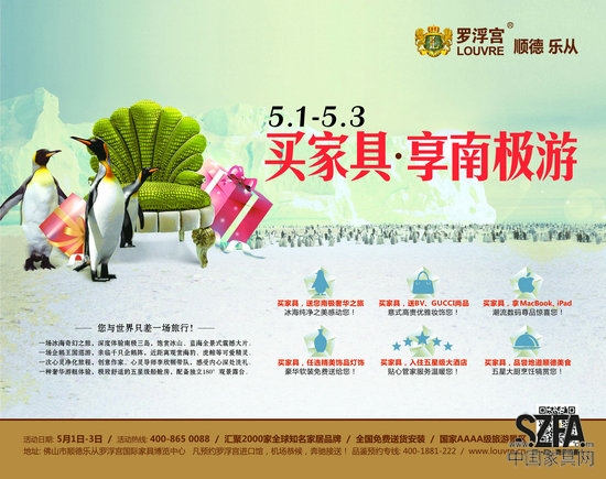 除了南极之旅的终极大奖外,到罗浮宫买家具,还有机会获得宝马自行车, BV宝缇嘉、GUCCI品牌名品,苹果MacBook电脑、iPad等数码产品,还有机会免费入住五星级酒店,享用地道顺德美食,尊享一站式贴心的皇家贵宾服务。