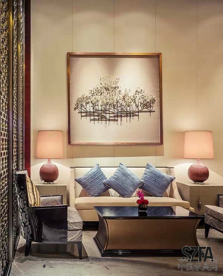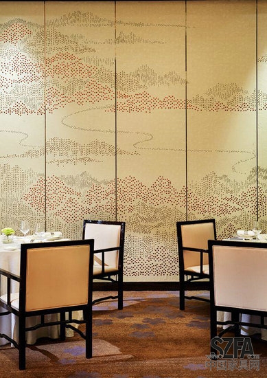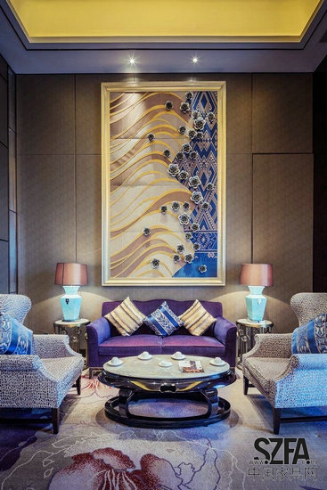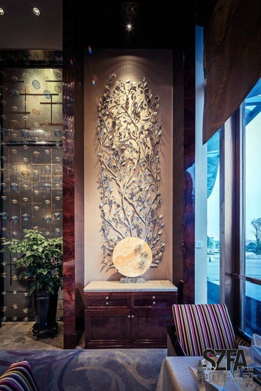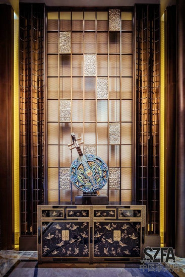 大堂的主背景以折扇的轮廓外形做了变化和叠加,使大堂背景呈现出优美的韵律,加上南京市花“梅”作为主景墙的点缀,让客户置身其中就能感受到浓浓的地域氛围。为了能让客户在大堂吧的体验上有一种全新的感受,营造出品牌酒店独有的品质奢华感以及安静的灯光氛围。