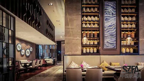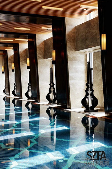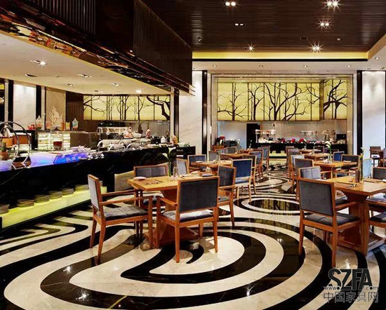 首先在平面关系上,总服务台被放置在平面的正中央,大堂吧及全日餐厅分别在右侧及后方,两个空间均采用开放式手法,空间与空间的借景和通透性更好的满足了立面的美感。