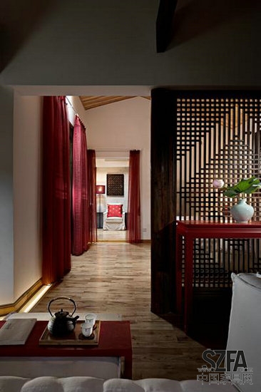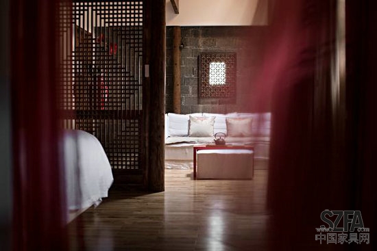 所有古建筑天井及公共部分完全按照老宅原样恢复如旧,而客房室内沿外墙一侧保留了原样,新隔墙均为白色石膏板面刷涂料,地板刻意挑选了带节疤柞木,原有木结构体均保持原样,自然而不露痕迹地将新与旧完美融合。室内色彩基本以黑白灰为主,局部间以跳跃的红色,绿色,黄色,使得空间不显沉闷,充满了现代时尚的气息。