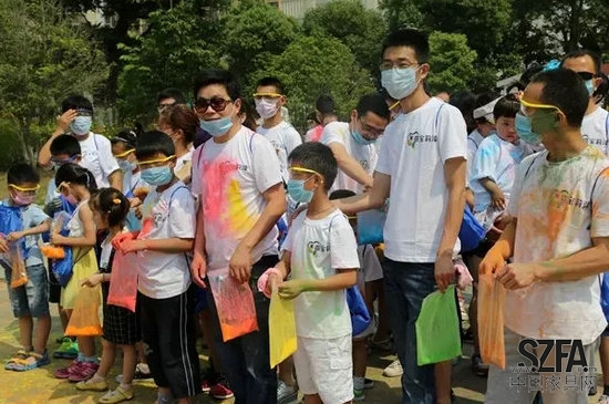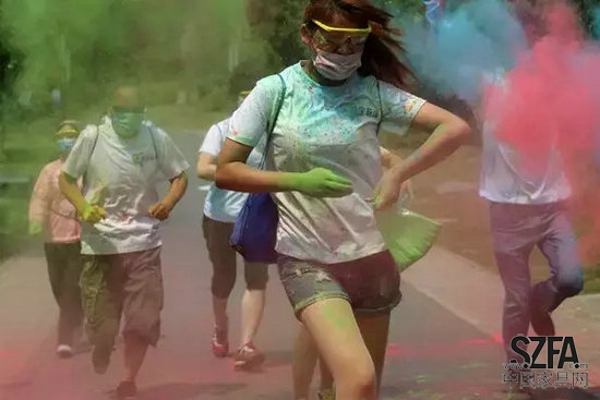 活动期间天公作美,不仅没有阴雨,天气也较前几日更加凉爽,因而前来参加彩跑的市民也较预期多出不少,为安全起见主办方不得不控制现场报名人数。截至上午9点,现场已是人声鼎沸,熙熙攘攘,好不热闹。不管是三口之家,还是夫妻恋人,抑或是三五好友,拿到文化衫、目镜、口罩、头饰、彩粉等“彩跑装备”的人们,已经急不可耐地在广场上追逐打闹,相互喷洒彩粉……