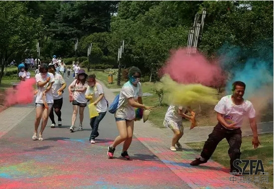 9点半,彩跑正式开始,在简单的热身运动之后,主持人一声令下,全体人员将手中的彩粉洒向天空,彩跑正式开始!长达两公里的公园主干道上,共设有四个彩站,每站都有工作人员“严阵以待”,彩跑参与者不仅要在奔跑中“享受”亲人朋友或其他人的“眷顾”,还得接受工作人员手中彩粉的“洗礼”。但要的就是这个味,玩得嗨才尽兴!所有参与者一路奔跑,一路玩耍,不断用彩粉在他人身上“创作”,一时间,五颜六色的“彩人”如雨后春笋般冒出。