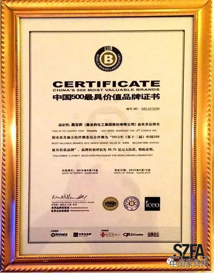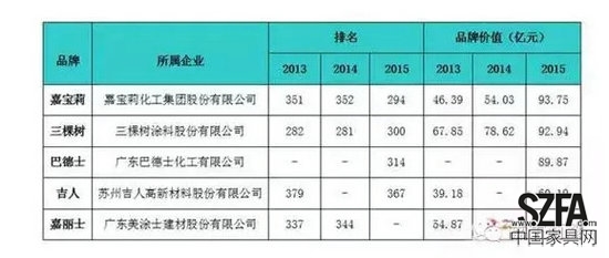 6月16日,世界品牌实验室在北京发布2015年《中国500最具价值品牌》排行榜。嘉宝莉以93.75亿元荣登“中国500最具价值品牌”排行榜,排名第294位,居上榜涂料企业榜首。