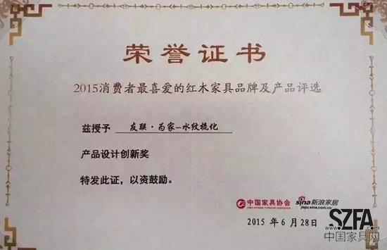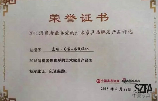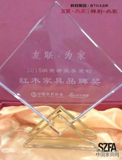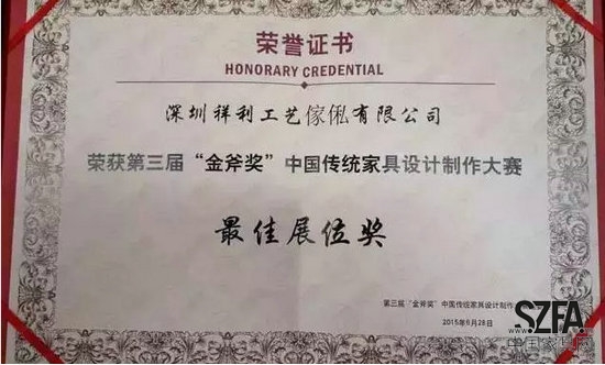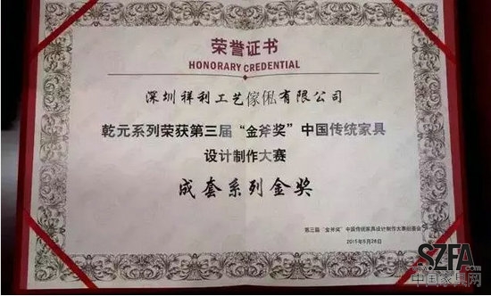 在刚刚结束的第三届“中国红木家具精品品鉴会”上,祥利为家新品家具“乾元系列”不负重望,一举斩获第三届“金斧奖”中国传统家具设计制作大赛“成套系列金奖”。祥利集团另一品牌“友联为家”被评为“2015年消费者最喜爱的红木家具品牌”,友联为家“水纹梳化”被评为“2015年消费者最喜爱的红木家具产品”,并获产品设计创新奖。祥利集团展厅则凭其独特的设计,荣获展会“最佳展位奖”。