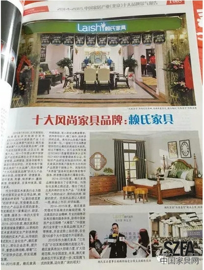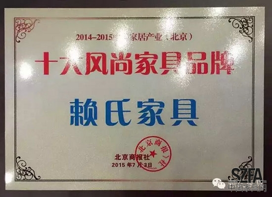 2015年7月3日,北京商报社、北商商业研究院联合发布《2014-2015中国家居产业(北京)十大品牌景气报告》,赖氏家具荣膺“十大风尚家具品牌”。