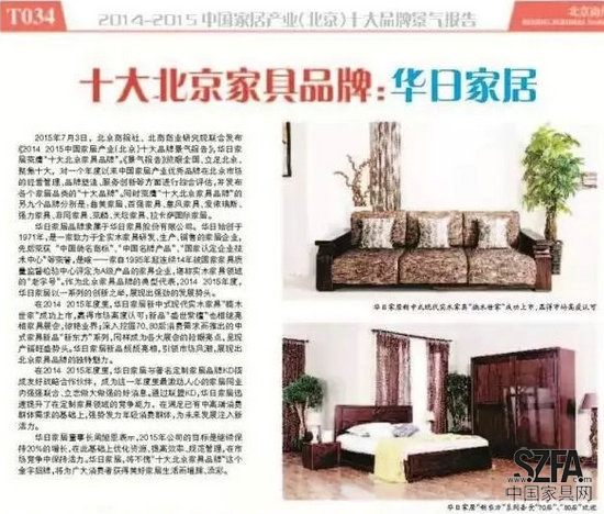“华日家居品牌隶属于华日家具股份有限公司。华日始创于1971年,是一家致力于全实木家具研发、生产、销售的家居企业,先后荣获“中国驰名商标”、“中国名牌产品”、“国家认定企业技术中心”、“全国质量工作先进单位”等荣誉,是唯一一家自1995年起连续14年被国家家具质量监督检验中心评定为A级产品的家具企业,堪称实木家具领域的“老字号”。作为北京家具品牌的典型代表,2014-2015年度,华日家居以一系列的创新之举,展现出强劲的发展势头。