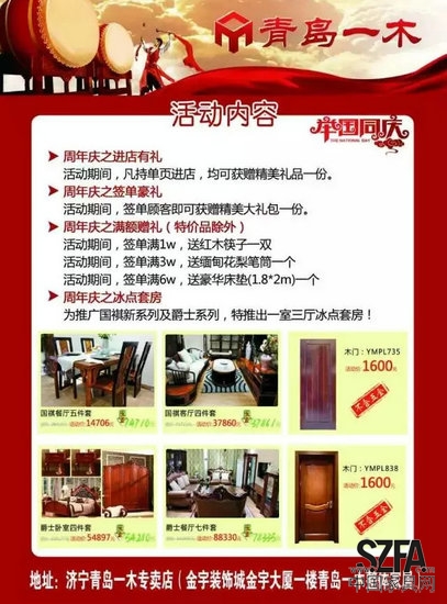 7月18号—7月19号活动地点:济宁青岛一木专卖店(金宇装饰城金宇大厦一楼青岛一木整体家居)1、周年庆之进店有礼活动期间,凡持单页进店,均可获赠精美礼品一份。2、周年庆之签单豪礼活动期间,签单顾客即可获赠精美大礼包一份。3.周年庆之满额赠礼(特价品除外)活动期间,签单满1w,送红木筷子一双活动期间,签单满3w,送缅甸花梨笔筒一个活动期间,签单满6w,送豪华床垫(1.8*2m)一个4.周年庆之冰点套房为推广国褀新系列及爵士系列,特推出一室三厅冰点套房!