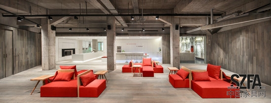 展厅入口直达中心区,全灰的基调现代感十足。偌大的中心区仅以几张红色的沙发点缀,令人不难体验到空间的封闭感。除中心区外,10个分区各具功能,分别为林景寓、智能间、酒店房等体验空间,以及卫浴、照明、技术、执手等产品专区,集建筑五金与家具五金于一体。与中心区的空旷不同,各体验空间、产品专区充满惊喜,宾客如欲前往,需亲手洞开大门! 不难想见,连接中心区与各个分区的灰色木质大门作为开启不同室内视角的关键,亦是海福乐五金相关推拉/折叠门解决方案的秀场。