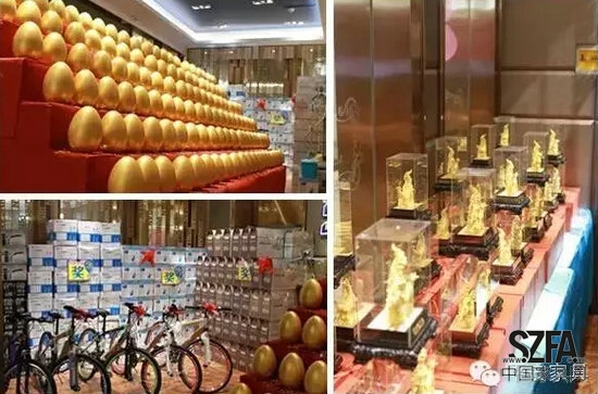 下午16时左右,平安家具7星钻石体验中心迎来了乘坐平安家具活动专车而来的大批业主朋友们,他们手持平安邀请卡并自觉排队进行了活动签到,领取了平安签到大礼包。在工作人员指引下,乘电梯进入三楼展馆的业主朋友刚转弯进入走廊,便被奖品区摆放整齐的金蛋与Ipad、挂烫机、咖啡机、夏凉被、山地车等奖品惊呆了,除了实物奖品,金蛋中更藏有多个不同金额的现金大奖,最大金额达888元!
