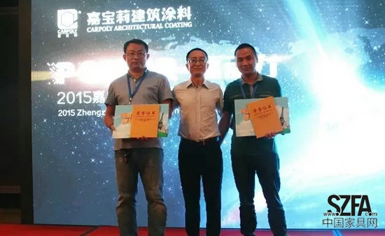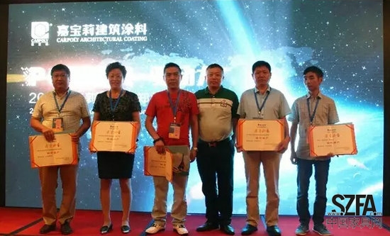 会议还对2015年上半年业绩突出的优秀工程漆客户进行了表彰。温州瑞丰控股集团有限公司被授予工程领航奖,刘元平、王瑜被授予为金销客户,周国防、王全生、陈琳、李建刚、崔建国被授予为标杆客户。卢总、曹总和王总分别为他们颁奖。
