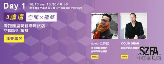 为促进台湾旅馆饭店设计与国际设计接轨,由台北市文化局指导,台北市室内设计装修商业同业公会主办之2015 TAID室内设计国际论坛「城市相对论/旅‧台北」将于10月13日(二)、14日(三)两天于台北寒舍艾美酒店、台北国计会议中心(TICC)大会堂举行,Neri & Hu、Alexandra Champalimaud及多位国际级大师,包括第一天论坛邀请到七位国际级空间设计大师,新加坡新锐建筑鬼才Colin Seah,Colin于2010年被International Design Awards USA选为年度设计师,亦是全球酒店业最高奖项,有设计界「奥斯卡」之称的Gold Key Award两届得主,也被Monocle杂志冠以「建筑界新星」称号。