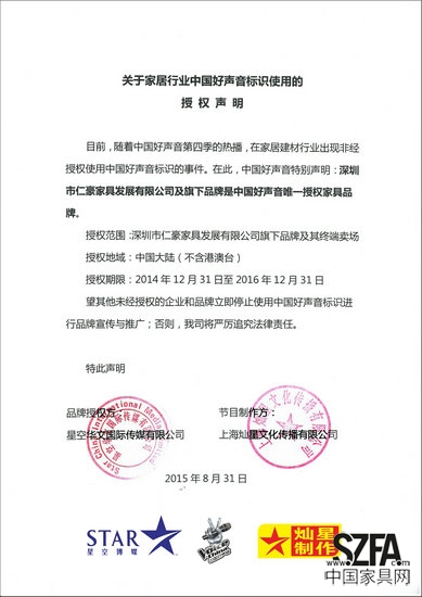授权声明:仁豪家具为中国好声音唯一授权家具品牌