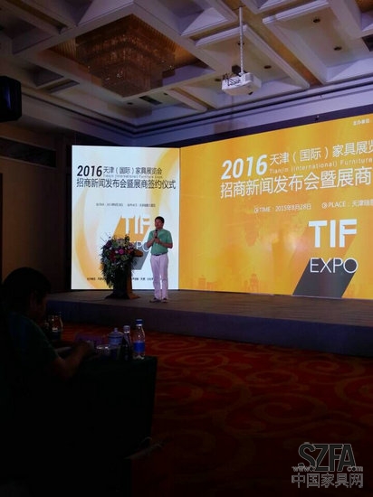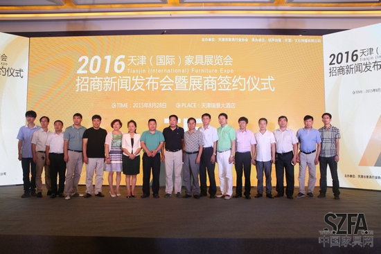 2015年8月28日,“比肩世界 爱木天津”——天津(国际)家具展览会招商新闻发布会暨展商签约仪式在天津瑞景酒店隆重举行。会议正式宣告,由天津市家具行业协会主办的第三届中天津(国际)家具展览会将于2016年5月28日至5月31日在天津梅江会展中心盛大举行。天津电视台、天津日报、今晚报、北方网、《新家具》、《中国家具报道》、《今日家具》等数十家媒体,共同见证本次发布会暨签约仪式的圆满成功。本次活动更为数月后开幕的第三届天津(国际)家具展览会做了有力的预热工作。
