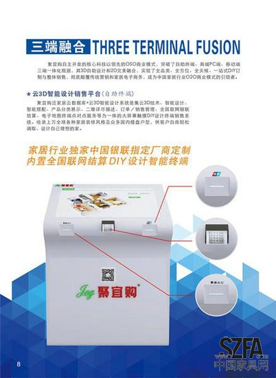 李忠新强调,聚宜购携手银联机构,其自助终端系统是由中国金融系统指定的硬件制造商定制,品质过硬,安全可靠,不仅可以实现全国银联支付资质,即时到付,安全畅顺,为自助销售、付款结算提供最具信心的保障;系统内置的电子地图为渠道提供定位点对点服务。这在全国家居行业内是唯一的,估计相当一段时期会无两。