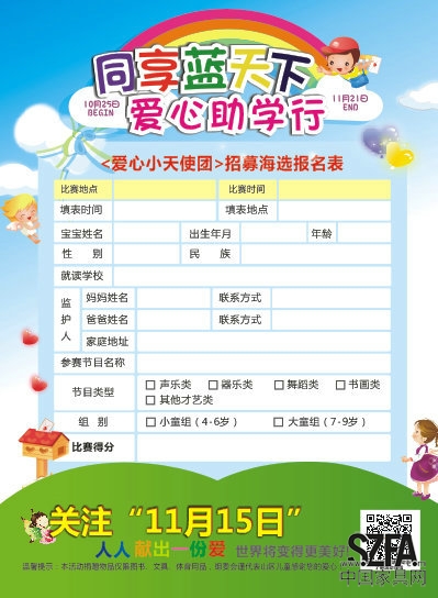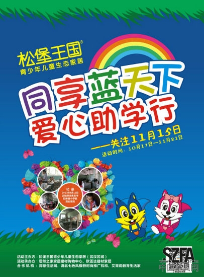 2015年10月武汉松堡王国携手七色风模特时尚推广机构将于10月17日举办“同享蓝天下,爱心助学行”大型公益活动,进行为期一个月的天使小天使选拔,选拔出一批爱心家庭,组成“爱心天使团”和我们共同前往湖北省阳新县浮屠镇的沿镇小学,将所有捐赠物资带给那里的孩子,给他们送去一份关爱,也给城市里的孩子们带来一趟心灵之旅。