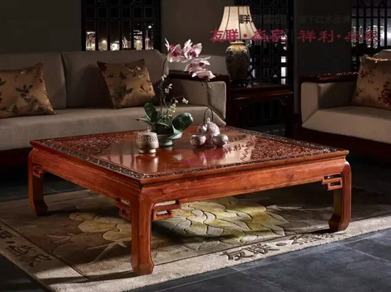 梳化面板和咖啡台面板圈饰黑色花纹,时尚典雅;咖啡台运用几何对称之美,雕饰对称角花,协调雅致,格高神秀。