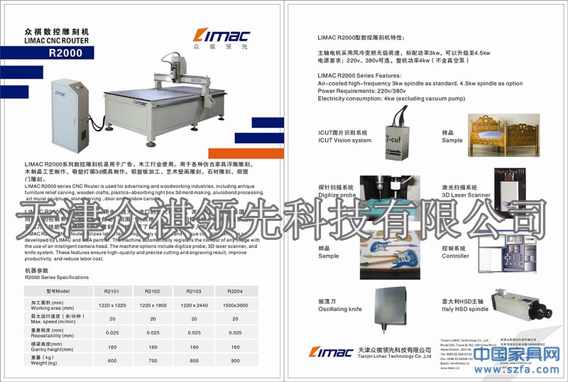 天津众祺型数控雕刻机采用全新技术和进口的意大利主轴,并配有LIMAC和美国共同研发的控制系统、可以支持自动识别图片的照相系统、探针扫描系统、激光扫描系统、震荡刀系统能够精确的切割和雕刻极大的提高了人工效率,降低人工成本LIMAC R2000