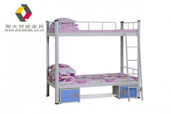 聚大家具生产的梧州市上下双层床采用1.2mm厚进口冷轧钢作为原材料,加厚横梁设计,结合卡扣式技术,双层床能承重500kg,还会因为受力卡扣结构越加牢固,同时还能保证使用过程中静音无噪声。