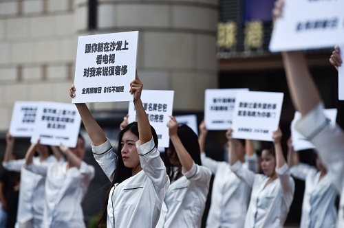 就在8月8日下午,上海地标环球港广场,她们集体站了出来,举牌向自己的丈夫抗议,控诉过度加班给家庭带来的伤害。这种安静沉默的行为,尽管没有过多的动作,却有着一股震撼人心的力量,让经过的行人也不禁动容,纷纷停下脚步观看。