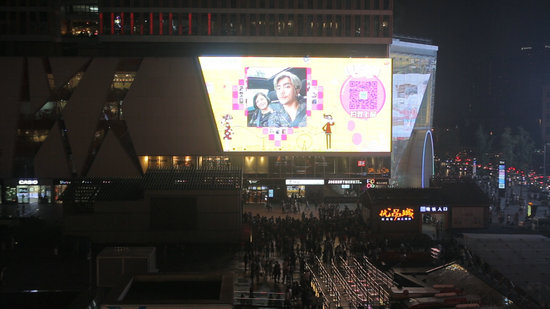 晚上8点左右,伴着《Sugar》的“甜蜜快闪”,舞者们向路人派发传单,通过扫描二维码,路人们纷纷进入“维爱刷屏”互动,无数情侣、夫妻的亲密合照,迅速登陆春熙路两块户外大屏,开始填充屏幕中的爱心,一发不可收拾。