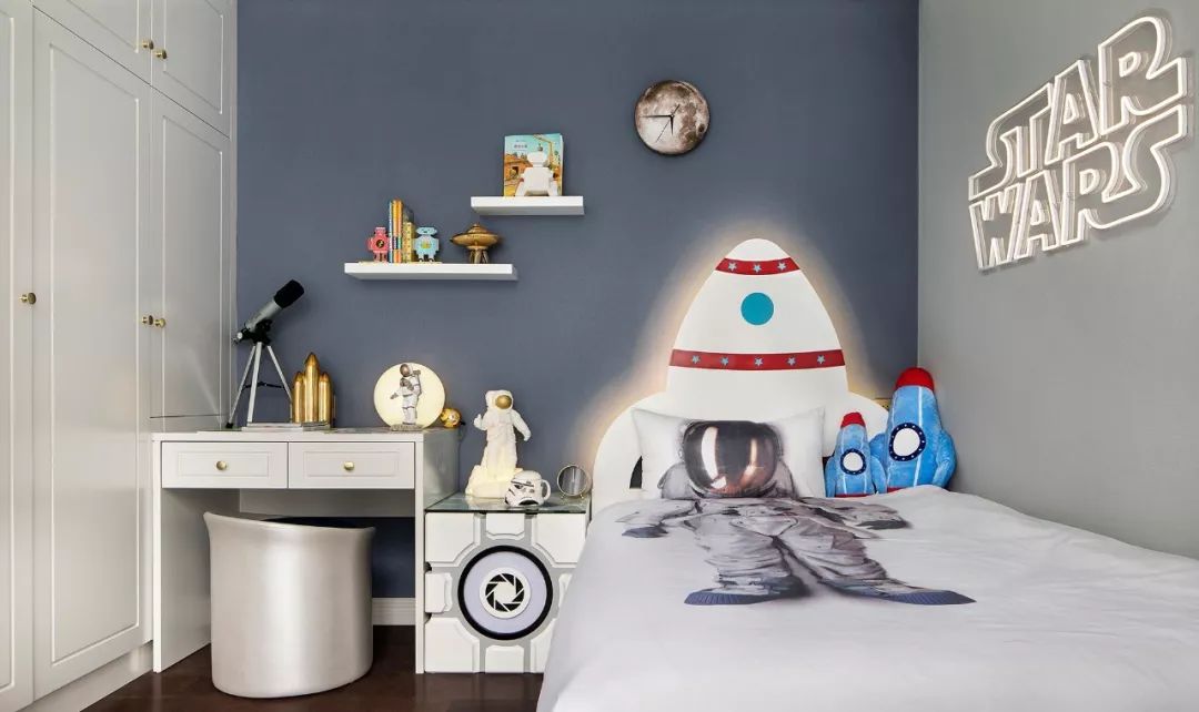 儿童房是宇宙太空的科幻主题,带有灰调的蓝色在空间中以丰富的层次、不一的功能呈现展演,更为耐看的陈设色调可以经得起小男孩心智的成长变化。随处可见的STARWARS周边、月球造型钟表和灯、太空舱床头柜与发光背景,搭载着小朋友稚嫩而精彩的梦,空间变得美好而富有童趣,是童年最为美好的生活馈赠。