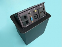 桌面隐藏式插座系列为用户提供了一个时尚、美观的桌面信号连接解决方案;它采用简单易用的接入方式,我们在连接视频、音频、计算机视频、网络、电话、电源等接口时,轻按连接盒的顶部,连接盒即时释放机械锁定器,接口盒面被气撑式结构平滑打开,完全展现出连接接口面,使用完毕后,只需轻轻按下接口盒盖,机械锁定器立即锁定连接盒;锁定后的连接盒与桌面保持齐平,所有接口被巧妙地隐藏起来,盒面美观整洁并与桌面浑然一体,该产品柔和开启,安全、方便插拔接口、开启容易、静音,可以在-10℃以上正常工作主要用于会议、酒店办公家具桌上,安装方便灵活,可以选择多个并排安装,目前是同类产品较高档的,最美观的一款多功能组合插座装置。